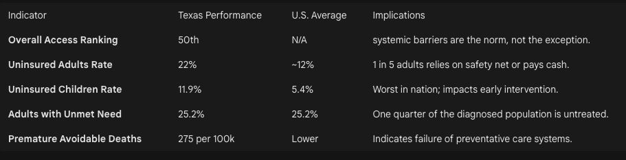 The Commonwealth Fund’s 2025 Scorecard corroborates the MHA findings, highlighting that the Texas health care system is structurally misaligned with thits population's needsundercountse needs of its population. The scorecard emphasizes that Texas has the highest rate of uninsured adults in the nation at 22%. This single statistic is the gravitational center of the mental health crisis. In a healthcare system predominantly driven by market rates and insurance reimbursement, lack of coverage is effectively a denial of service for all but the most acute, life-threatening emergencies.